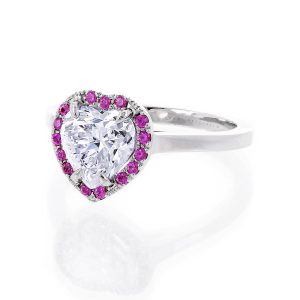 4,800.00CHF – 5,200.00CHFPrezioso anello in oro bianco 18kt con diamante centrale a forma di cuore da 2.00ct. circondato da meravigliosi rubini taglio rotondo da 0.25 ct.